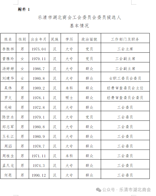 根據《工會基層組織選舉工作條例》有關要求,經會員充分醞釀討論,由上屆工會委員會提出候選人建議名單,報經黨組織審查同意,確定樂清市湖北商會工會第二屆聯合會委員、主席候選人建議名單,現將候選人建議名單進行公示。公示時間為5個工作日。如有疑議,可在公示期間通過來電、來信、來訪等途徑向樂清市湖北商會單位反映,聯系電話:18367775750。