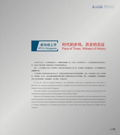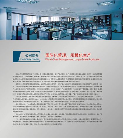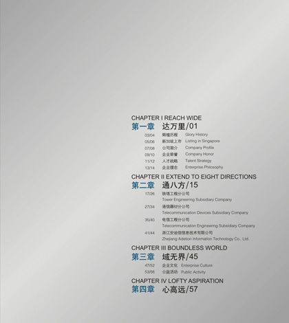 浙江八方電信有限公司創(chuàng)建于1997年,是一家集通信器材設備、軟件產(chǎn)品的研發(fā)、生產(chǎn)、銷售及電信工程設備安裝、施工為一體的集團型國家級高新技術企業(yè)。下設通信器材、鐵塔工程、電信工程和浙江安迪信信息技術有限公司四個分子公司。2004年7月23日,八方電信在新加坡主板市場成功上市,成為浙江省首家在新加坡上市的高科技企業(yè)。公司現(xiàn)有百余項國家專利,并具有國家電信工程專業(yè)承包壹級資質、通信信息網(wǎng)絡系統(tǒng)集成乙級資質,是目前國內發(fā)展較迅速的通信網(wǎng)絡設備及解決方案供應商之一。 銘陽廣告公司作為八方電信集團主要的平面設計業(yè)務合作商,先后為其做過畫冊設計、期刊設計、工廠環(huán)境設計、辦公及車間內企業(yè)文化宣傳設計等,產(chǎn)品及服務受到八方電信集團各部門一致好評。
