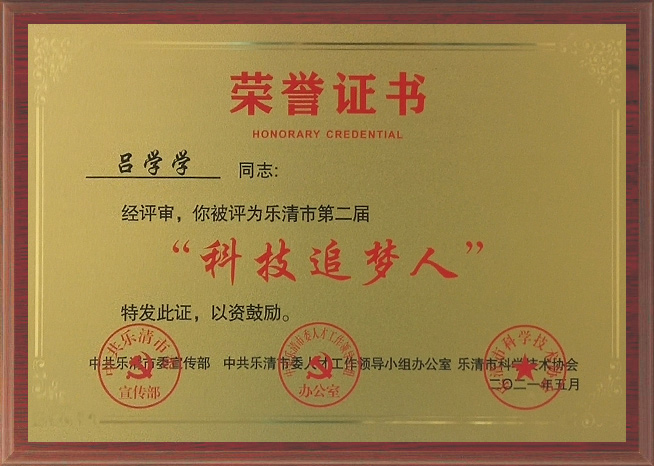 8、2021年,呂學學榮獲第二屆“樂清市科技追夢人”。